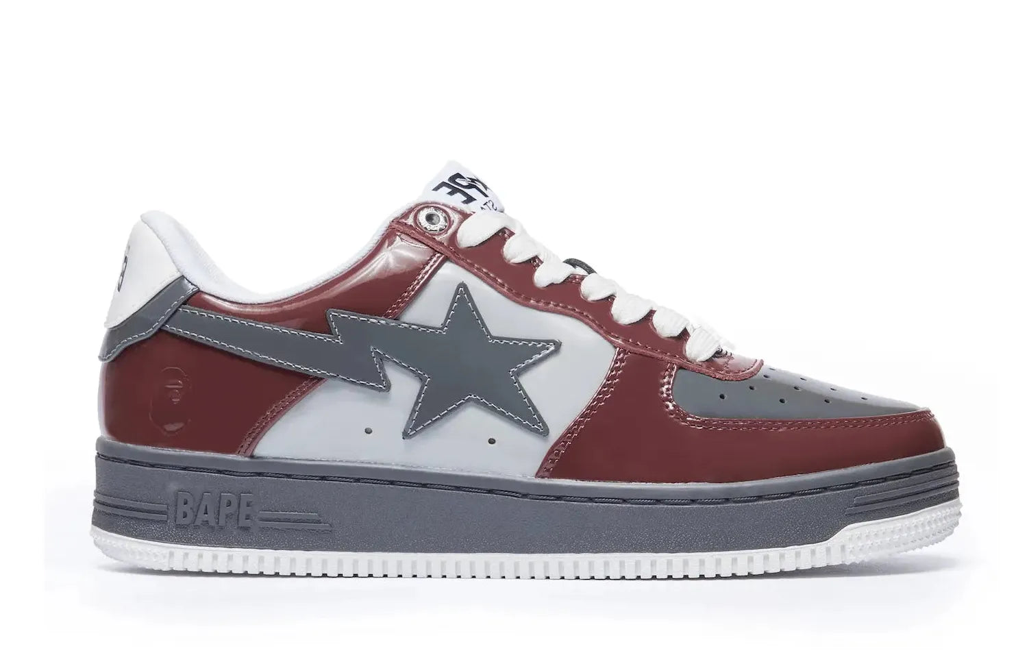 Boasting a rich burgundy hue contrasted with accents of grey, these shoes offer an effortless balance of color that's sure to turn heads. The detailing on these sneakers is as intricate as it is captivating, reinforcing the mark of quality synonymous with the Bape brand.