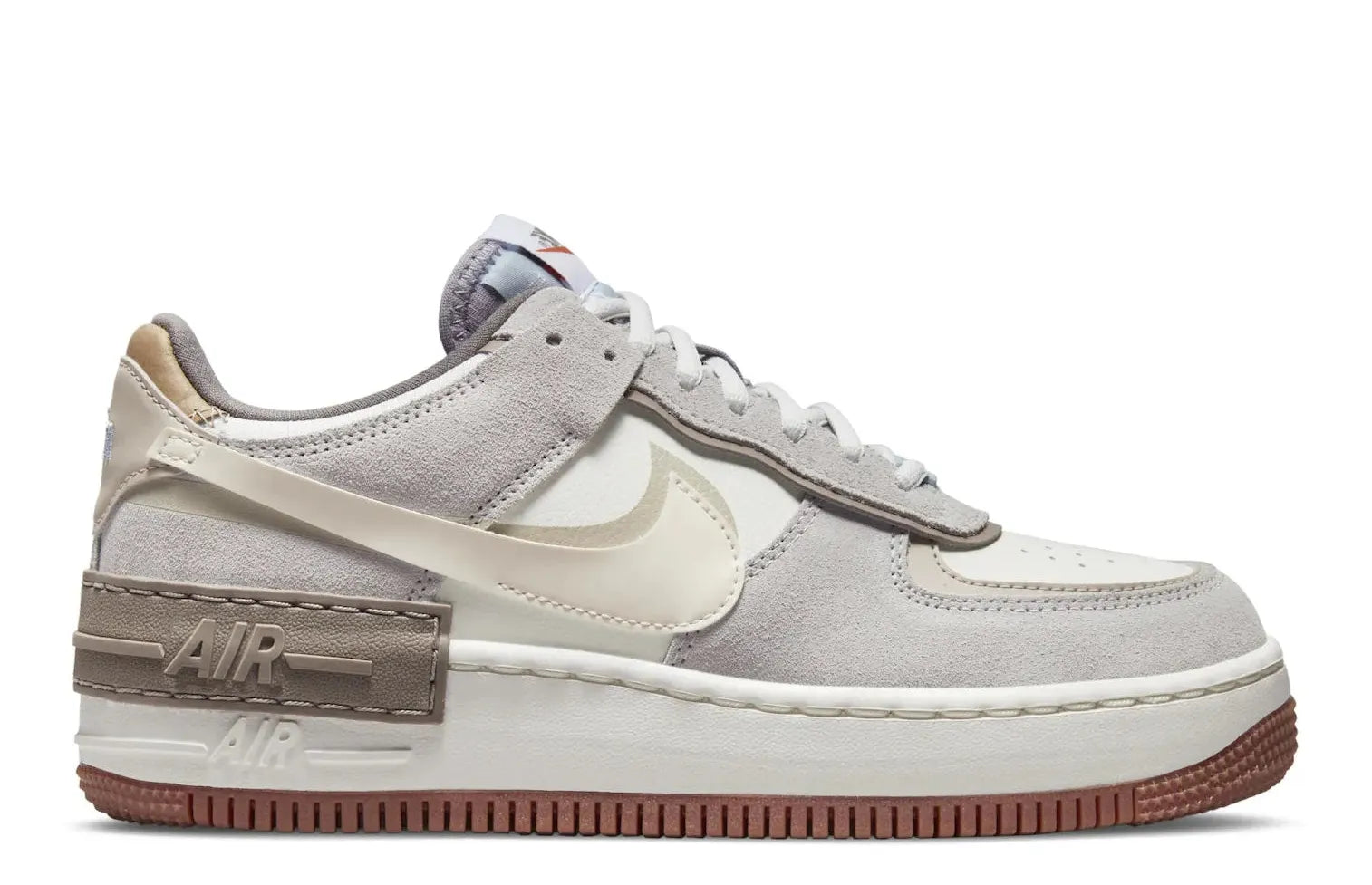 At Relace, we offer the exquisite Air Force 1 Shadow Sail Pale Ivory, endowed with the striking feature of Grey suede overlays. These overlays enrich the silhouette by activating the exclusive layering techniques emblematic of the Shadow series. Highlighting the overall design are warm brown accents on the heel tab, rubber overlay featuring the "AIR" branding, and the outsole.