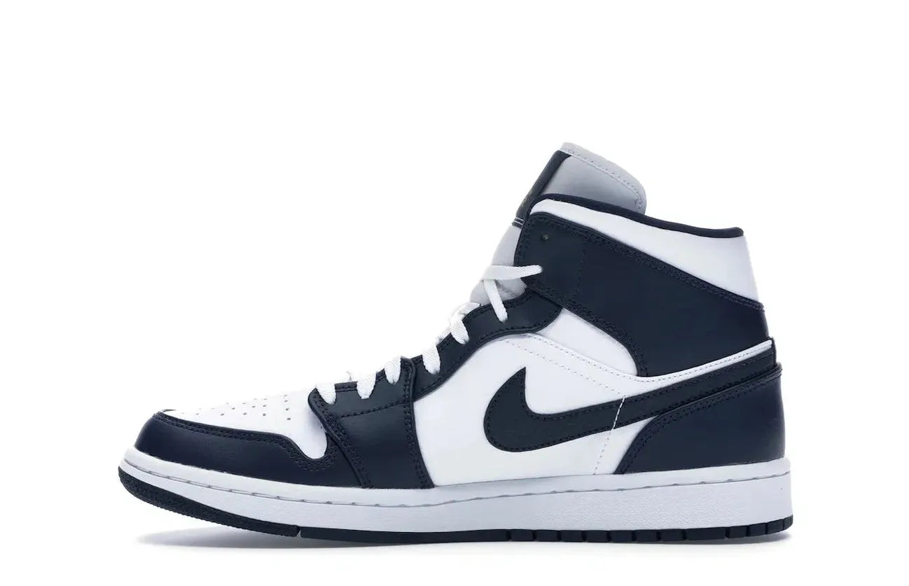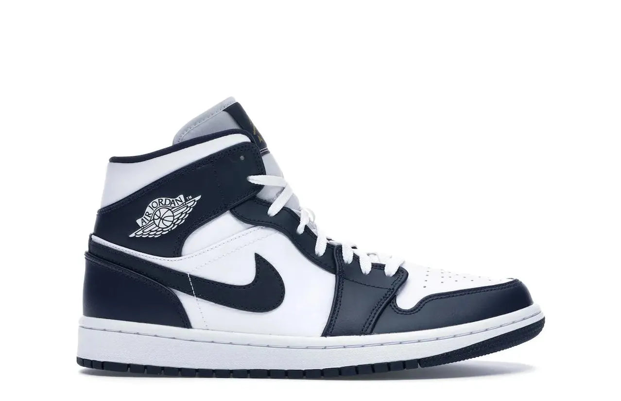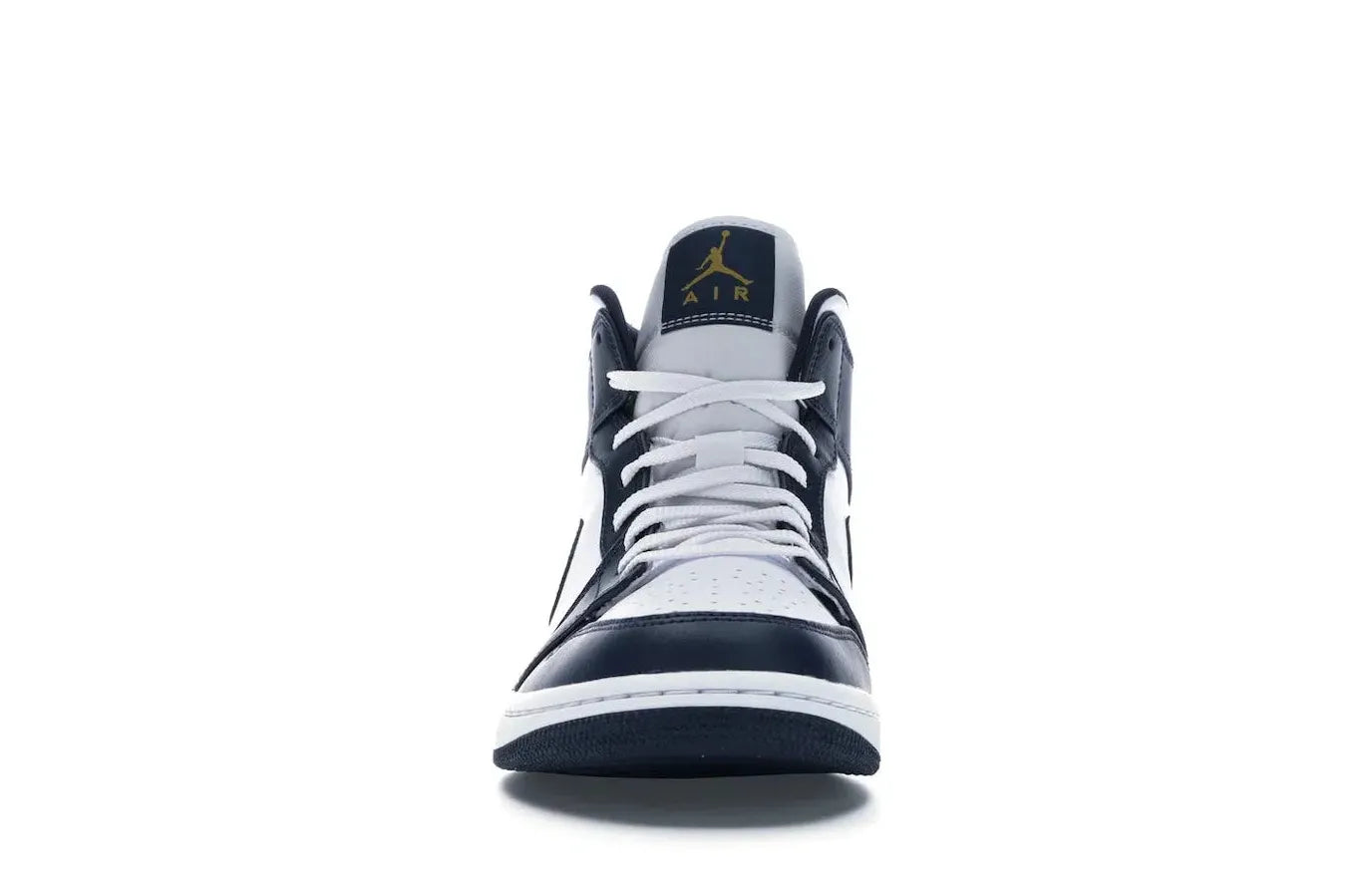 The Air Jordan 1 Mid White Metallic Gold Obsidian, available at Relace, is recognized by its distinguished white Air Jordan Wings insignia on the collar and the metallic gold Jumpman logo on its tongue label. Since its first launch in August 2019, it has been a sought-after choice among sneaker enthusiasts.