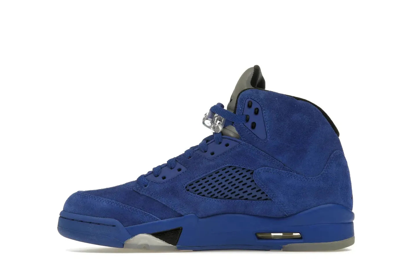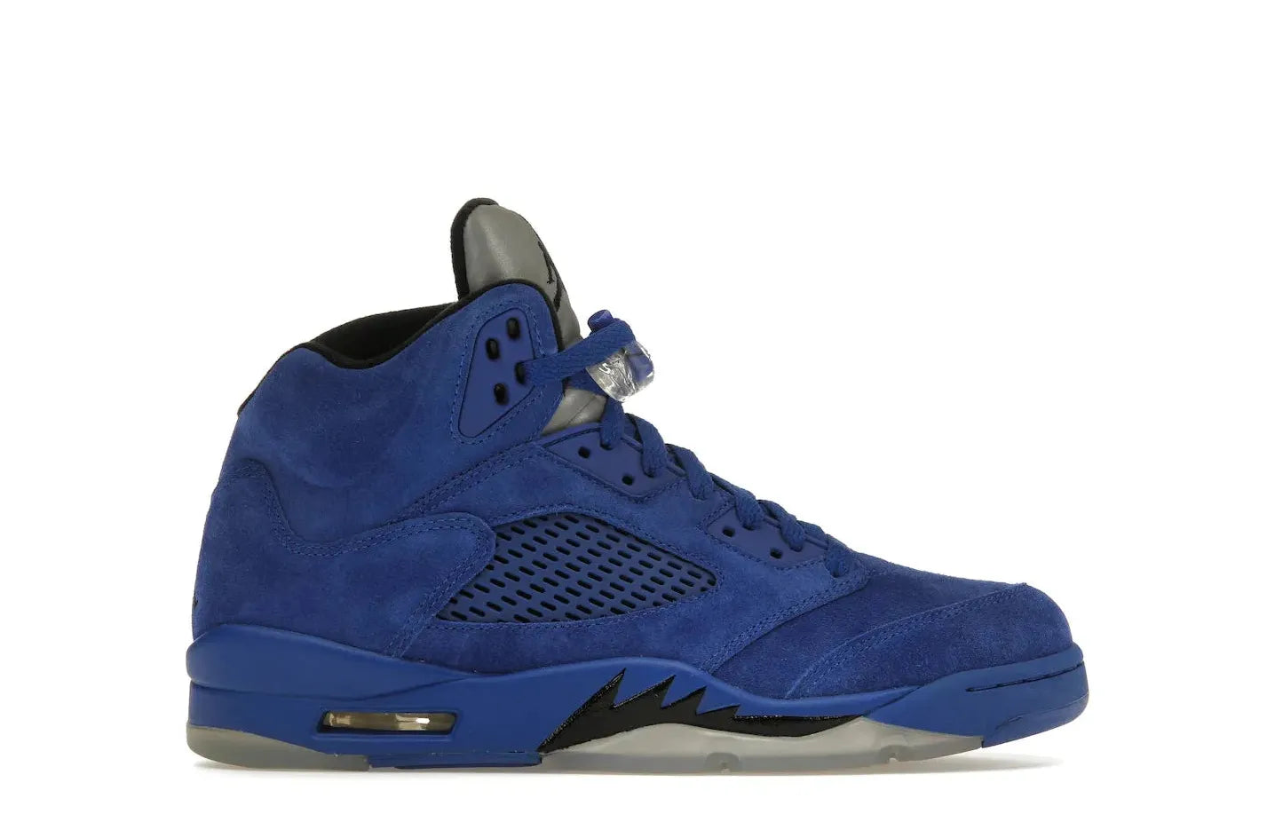 The Air Jordan 5 Retro Blue Suede distinguishes itself further with a grey tongue showcasing a Jumpman logo elegantly stitched in black. Along the side, it features a perforated lateral panel enhancing its design with an added touch of textural contrast. The Retro Blue Suede model from Air Jordan was first introduced into the public domain via Relace in 2017. With its impeccable design and superior comfort, it has been a standout selection ever since.