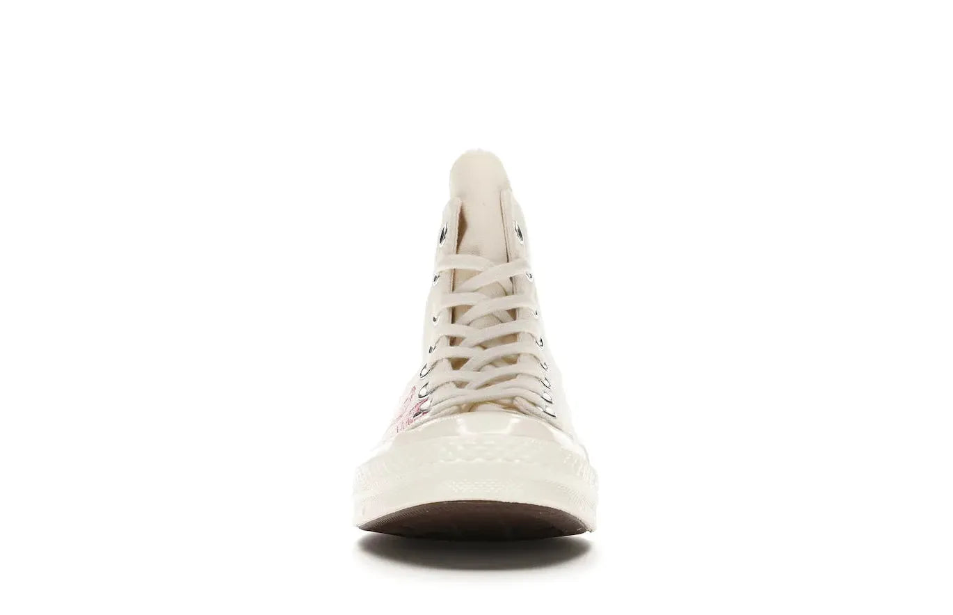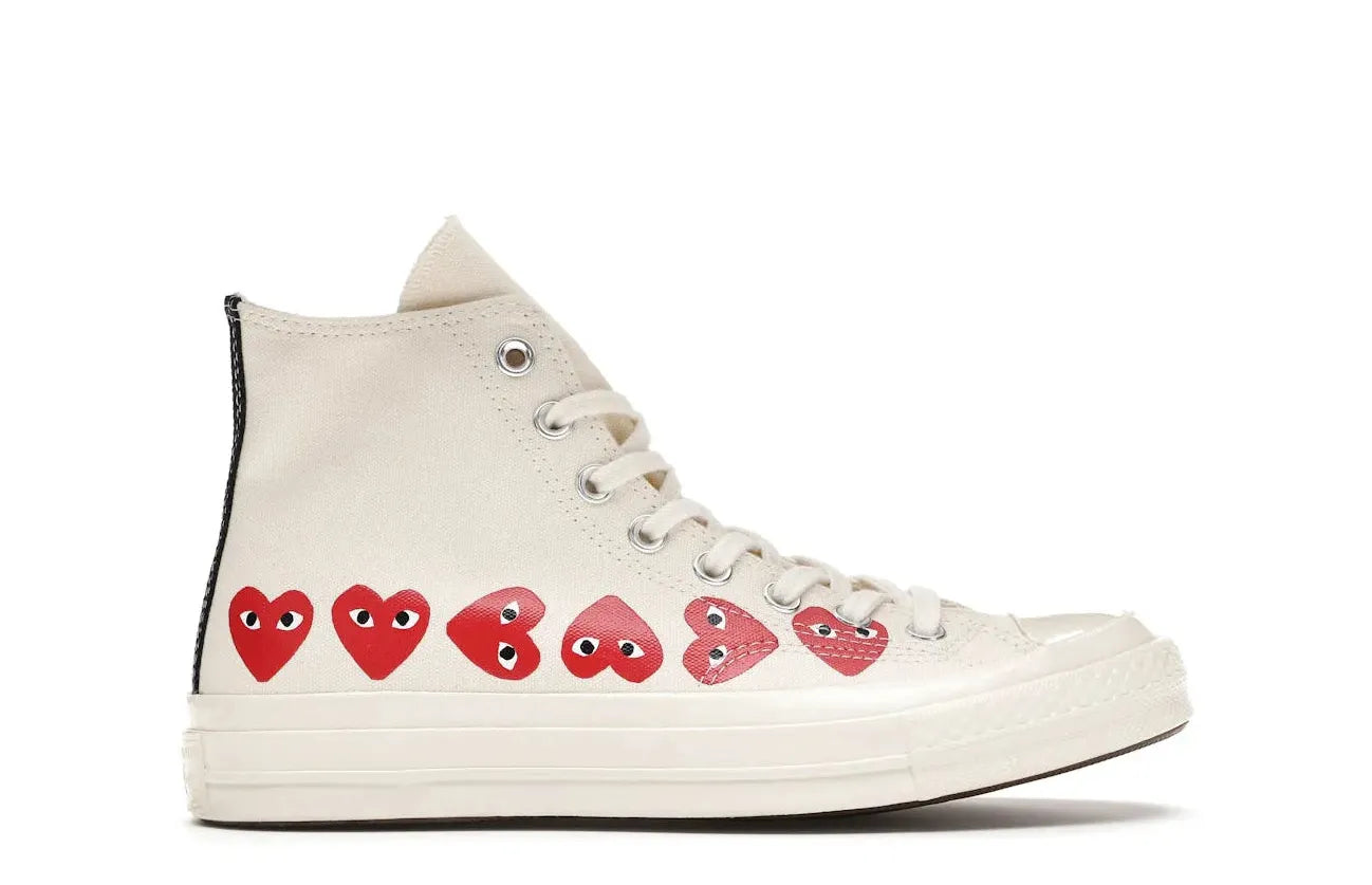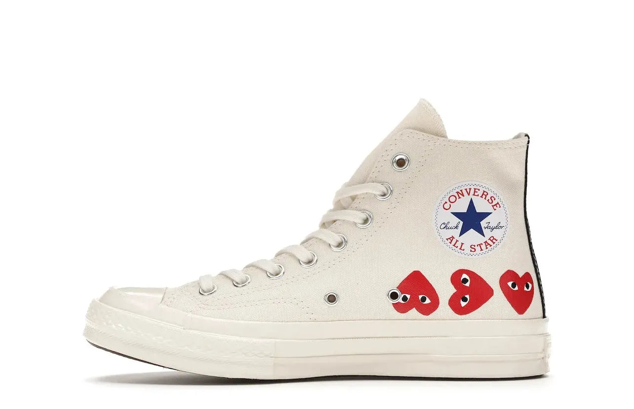 The heart logos stand out on a pristine off-white backdrop that harmonizes beautifully with the shade of the laces and heel available at Relace. The off-white colorway maintains its stately elegance with the presence of just two contrasting elements - a black strip at the heel and the iconic Converse Chuck Taylor All Star logo on the side.