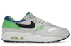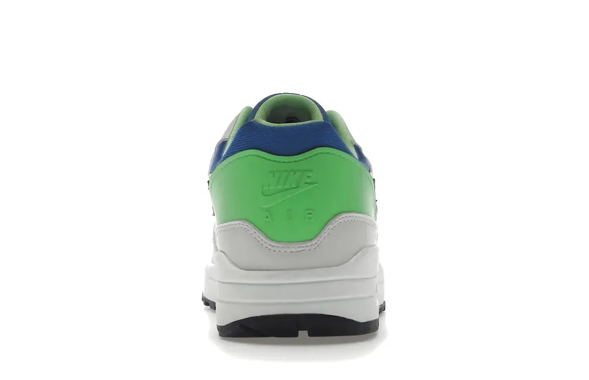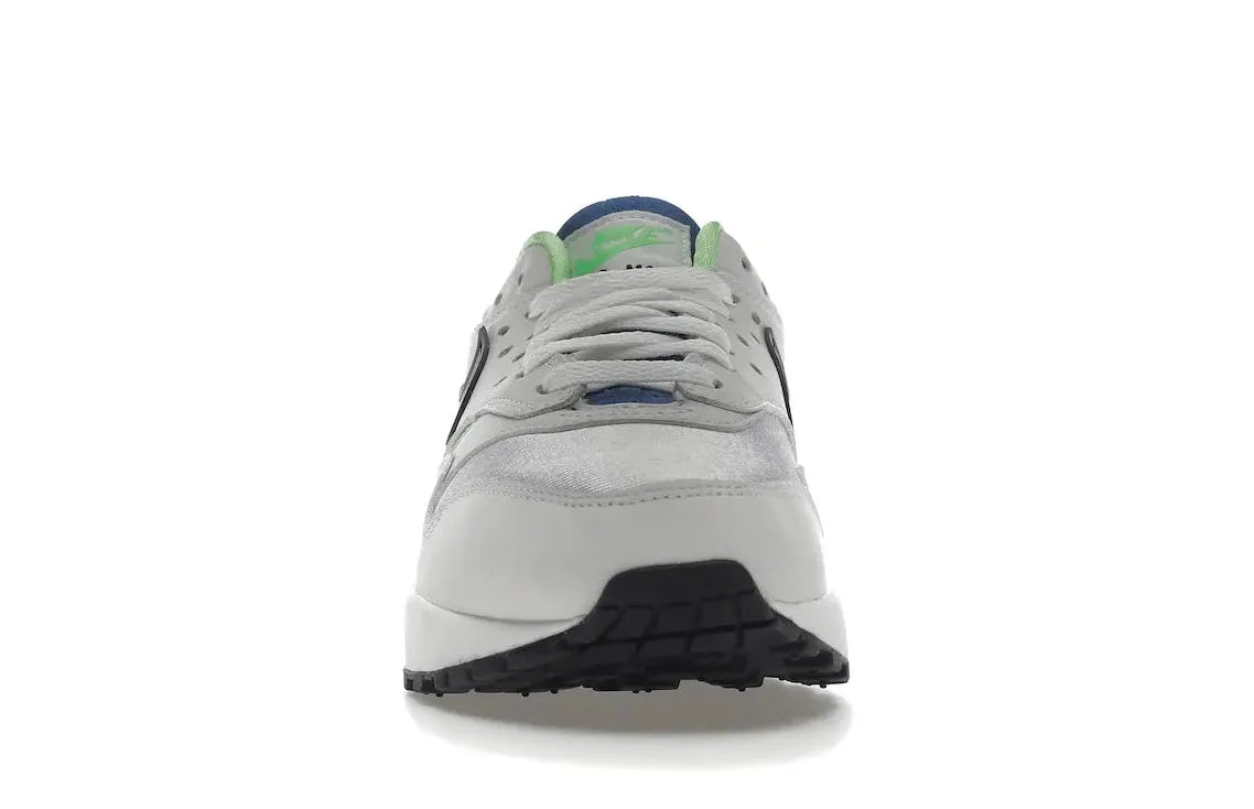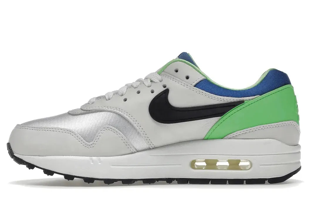 Relish in the Air Max 1's classic Scream Green colorway, a feature that simultaneously enhances the Huarache silhouette of the shoe. The blue trim complements the white base, lending an appealing contrast, underscoring the shoe's fashion-forward aesthetic.