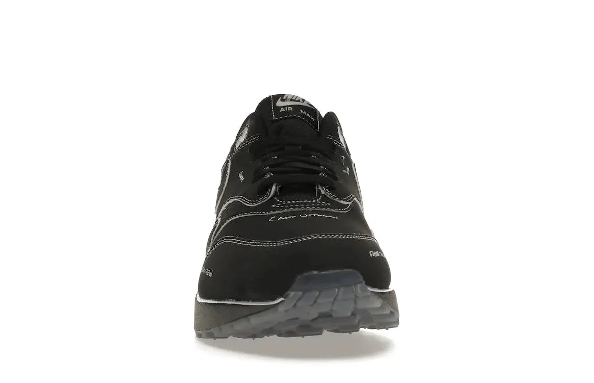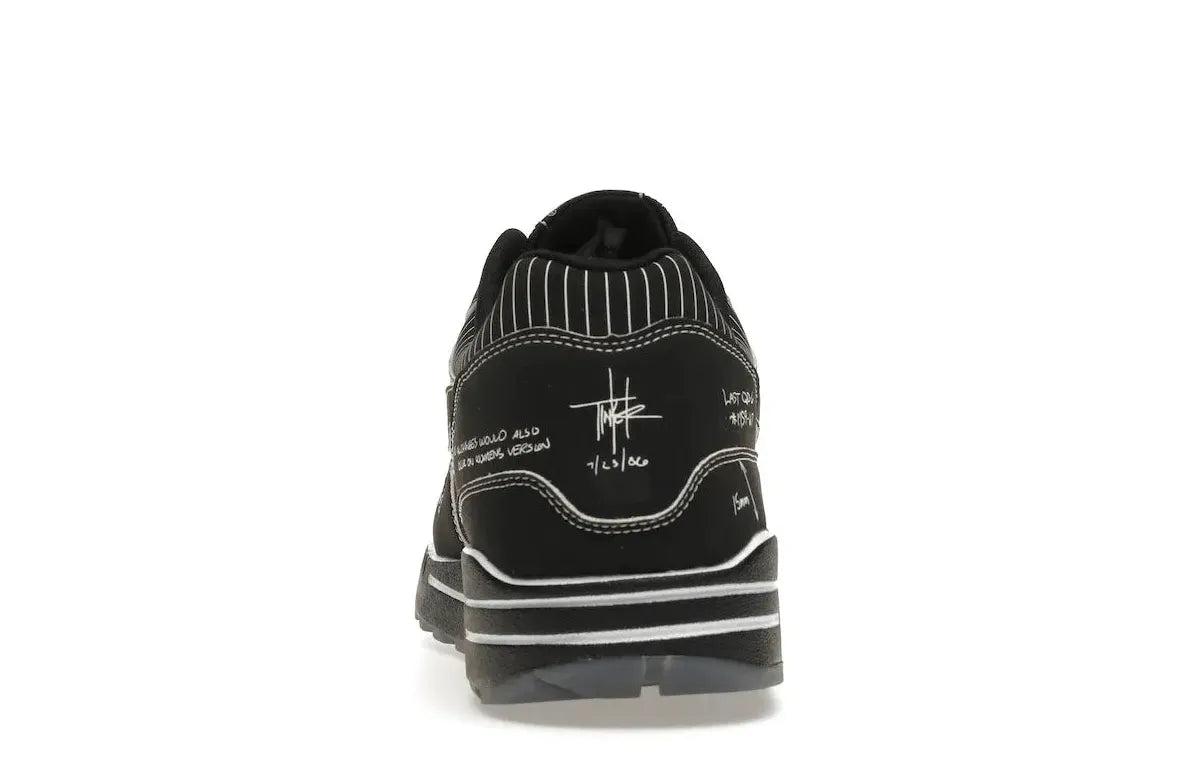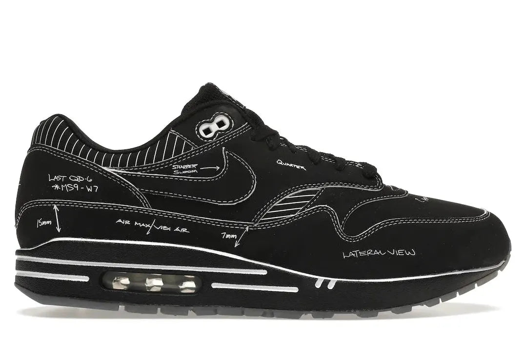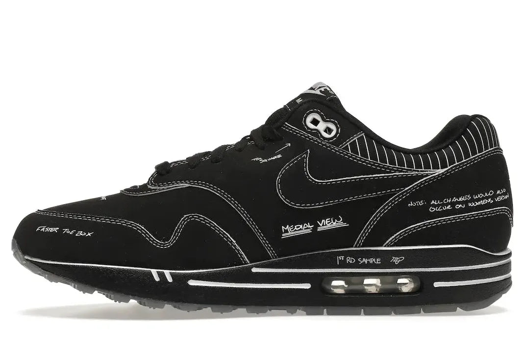 One of the standout features of this shoe is Hartfield’s handwritten notes and symbols adorning the shoe's upper, making the Nike Air Max 1 Tinker Sketch to Shelf Black truly distinctive among sneakers. Discover an exceptional blend of comfort, style, and individuality with the Nike Air Max 1 Tinker Sketch to Shelf Black.