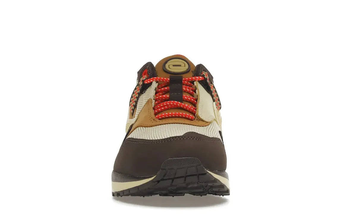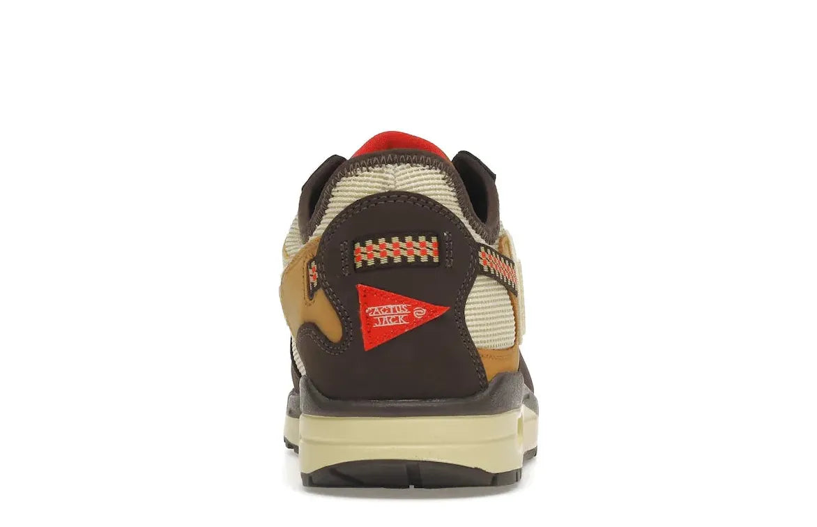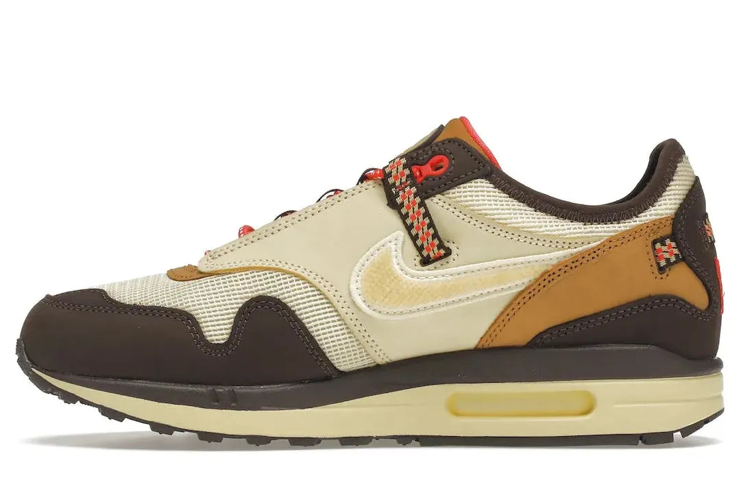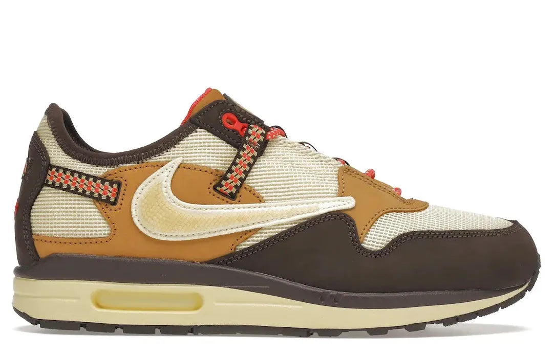 The shoe further embraces a hiking motif through a drawstring Gillie lacing system, a common feature on trail runners. The design is finally tied together with a yellowed sole crowned with a cloudy Air unit. Experience the unique blend of style and comfort with the Nike Air Max 1 Travis Scott Cactus Jack Brown at Relace.