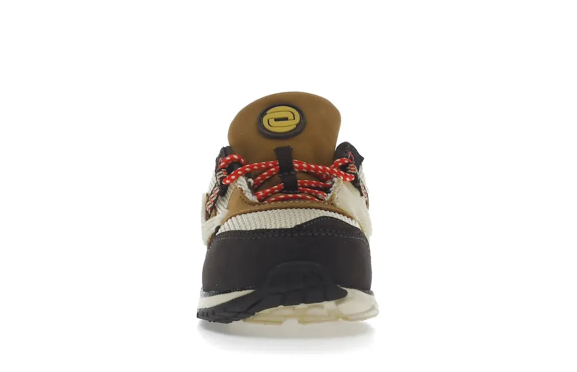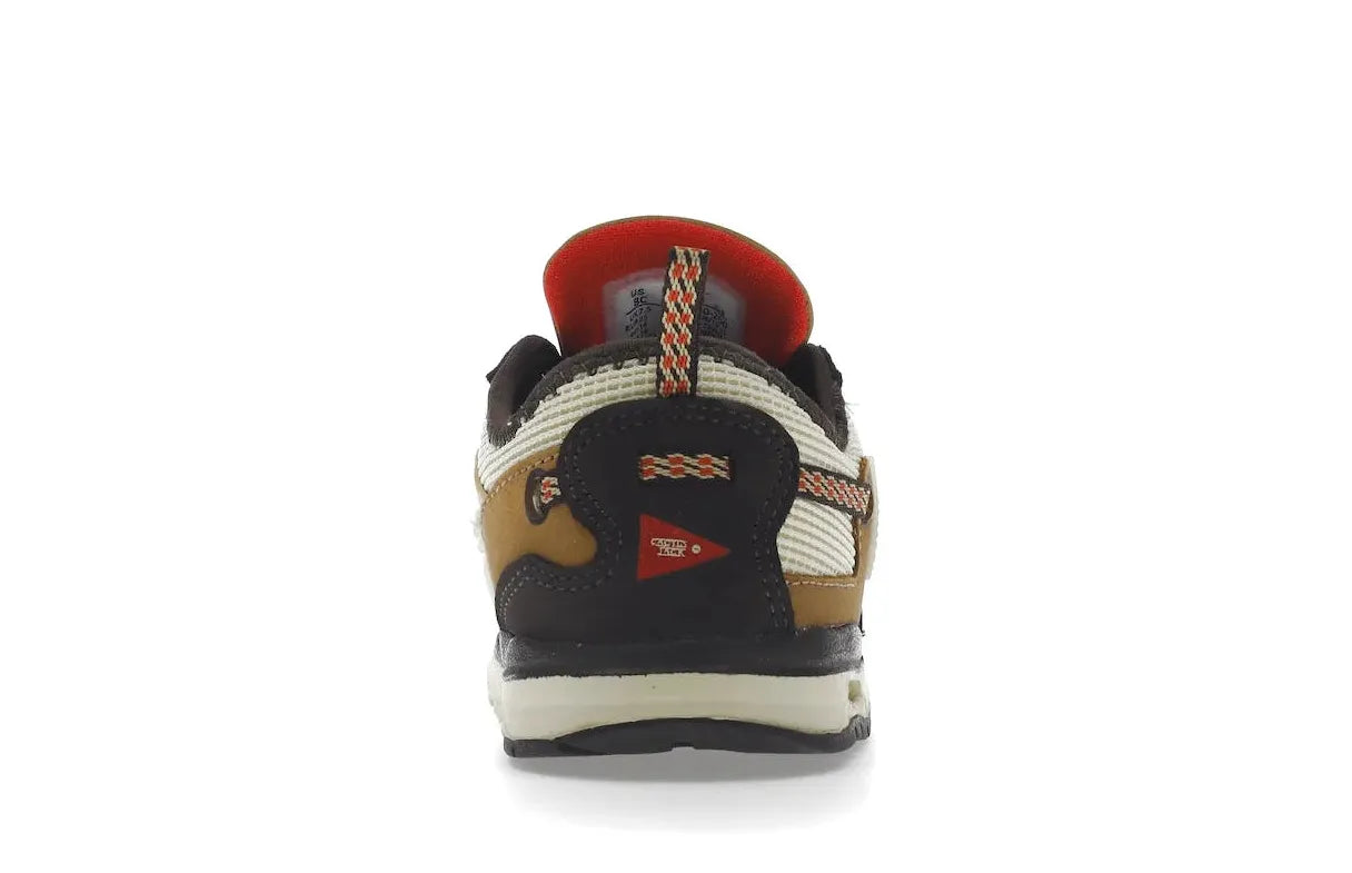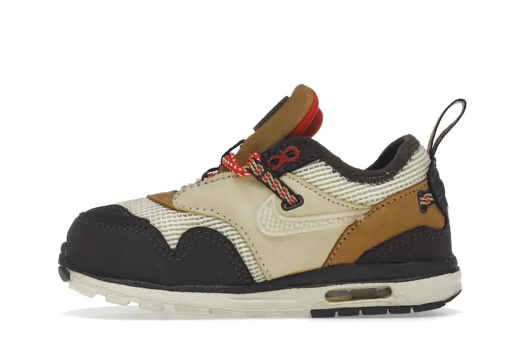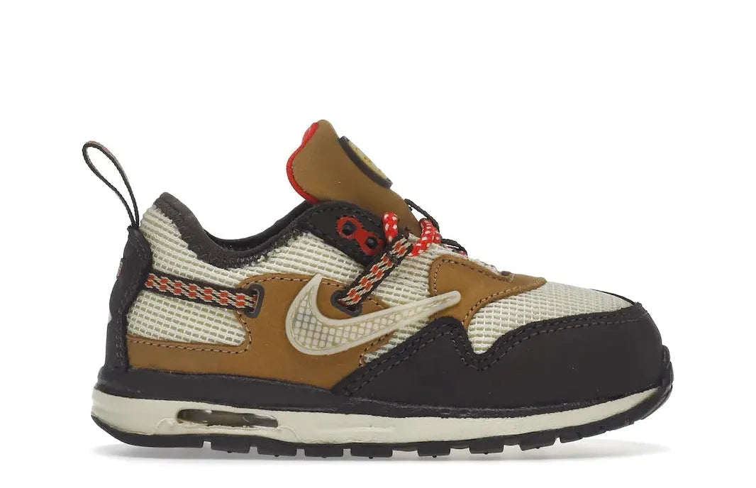 Crafted carefully with high-quality plastic fiber material, the Nike Air Max 1 Travis Scott Cactus Jack Baroque Brown (Toddler) available at Relace is truly a detail-oriented piece. The aesthetically pleasing combination of baroque brown, lemon drop, wheat, and chile red threads are woven together, adding texture and sophistication to the shoe's upper silhouette.