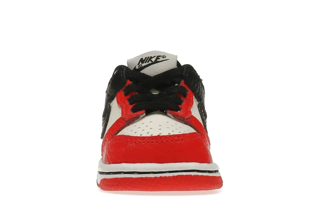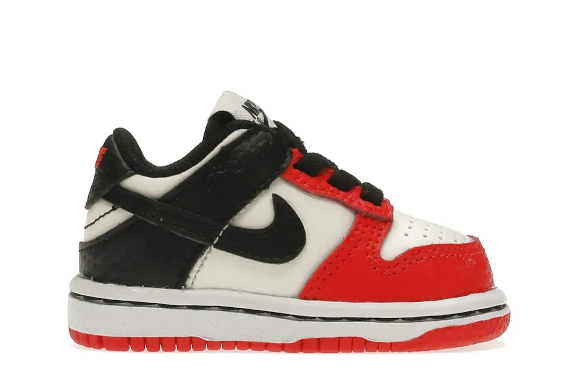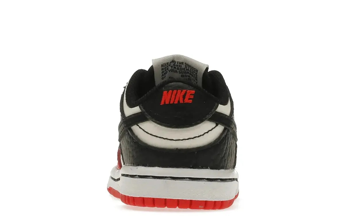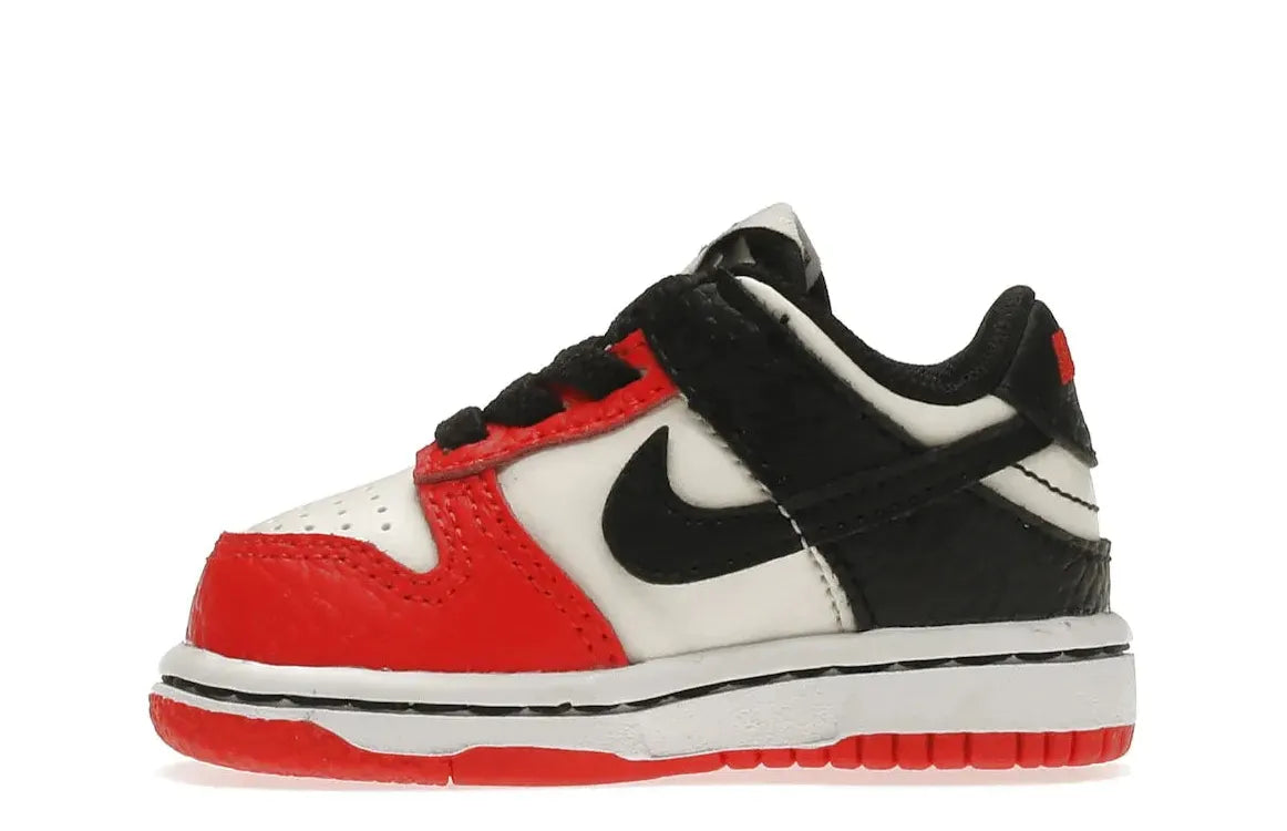The Dunk Low EMB Chicago TD from Relace is adorned with a black leather Swoosh on its lateral and medial sides. Its design is completed with metallic lace dubrae, etched with a diamond motif symbolizing the NBA's diamond anniversary. The final touches include red outsole bottoms, black contrast stitching, and white midsoles, all contributing to its overall impressive design.