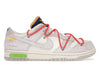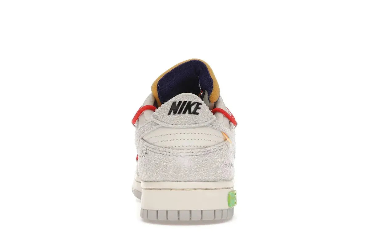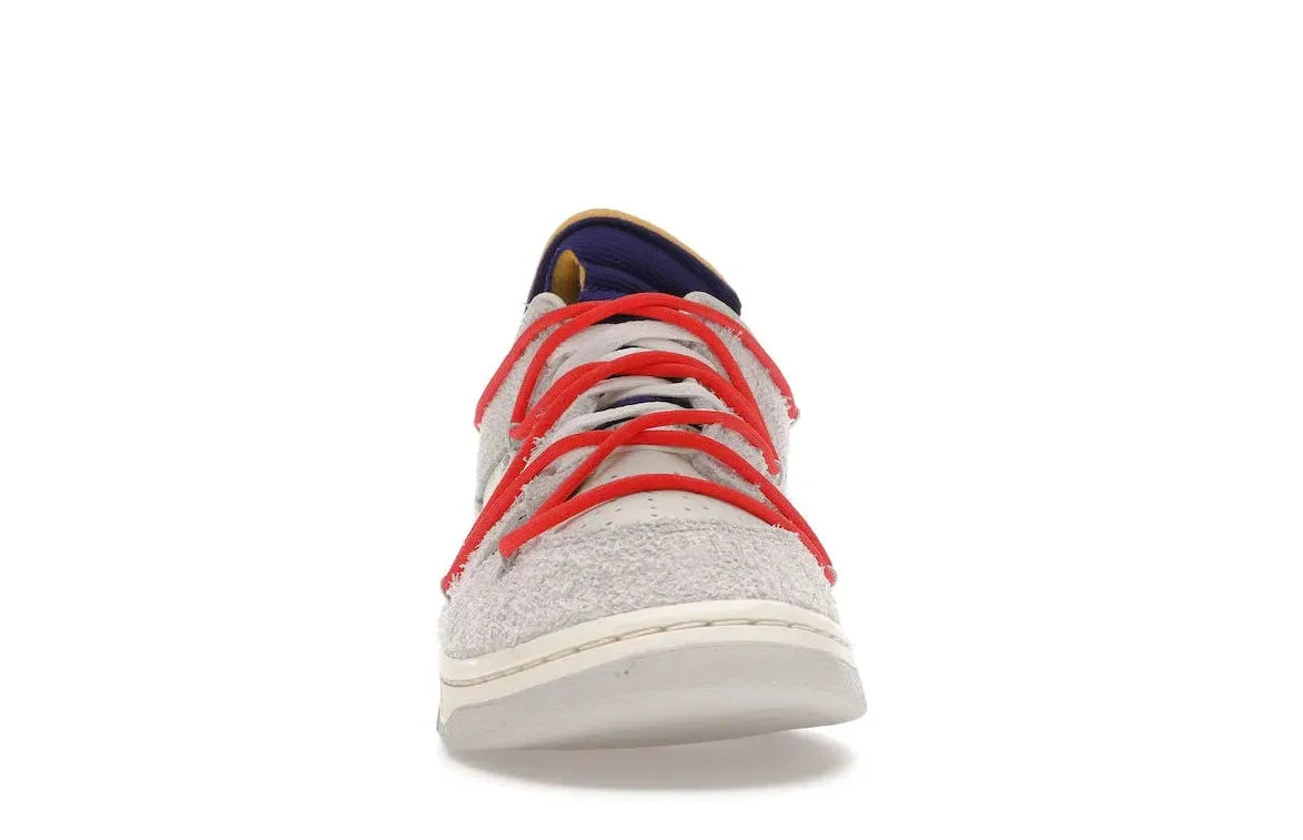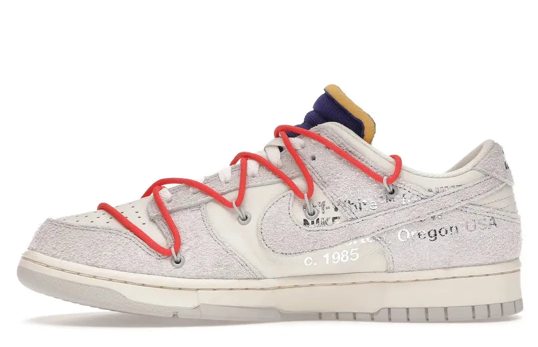 The Nike Dunk Low Off-White Lot 13, offered by Relace, sports a white leather upper accented by grey suede overlays. This low-top sneaker's distinctive Off-White touch can be seen with the inclusion of a plastic zip tie and Helvetica text.