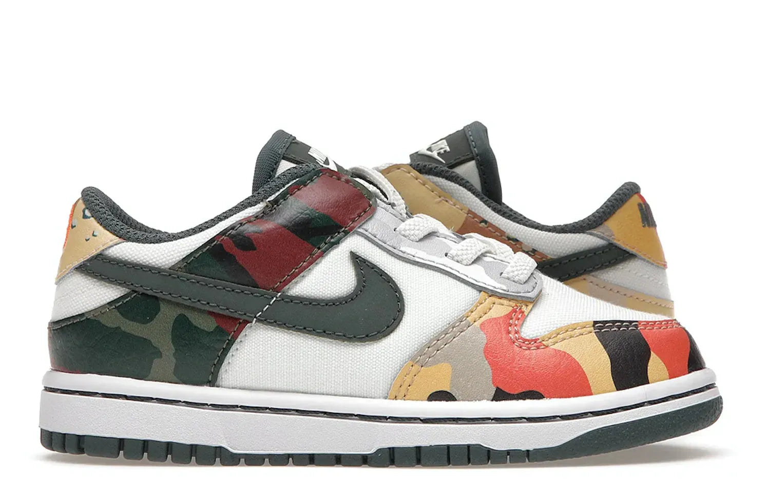 Vougish yet functional, this toddler edition Nike Dunk Low features the renowned 'NIKE' word logo on the left shoe and a creatively embroidered basketball graphic on the right. This fashionable pair is comfortably set on a White midsole, complemented by a Dark Green durable rubber outsole. Initiate your little one into the world of streetwear with a style statement straight from our latest collection.