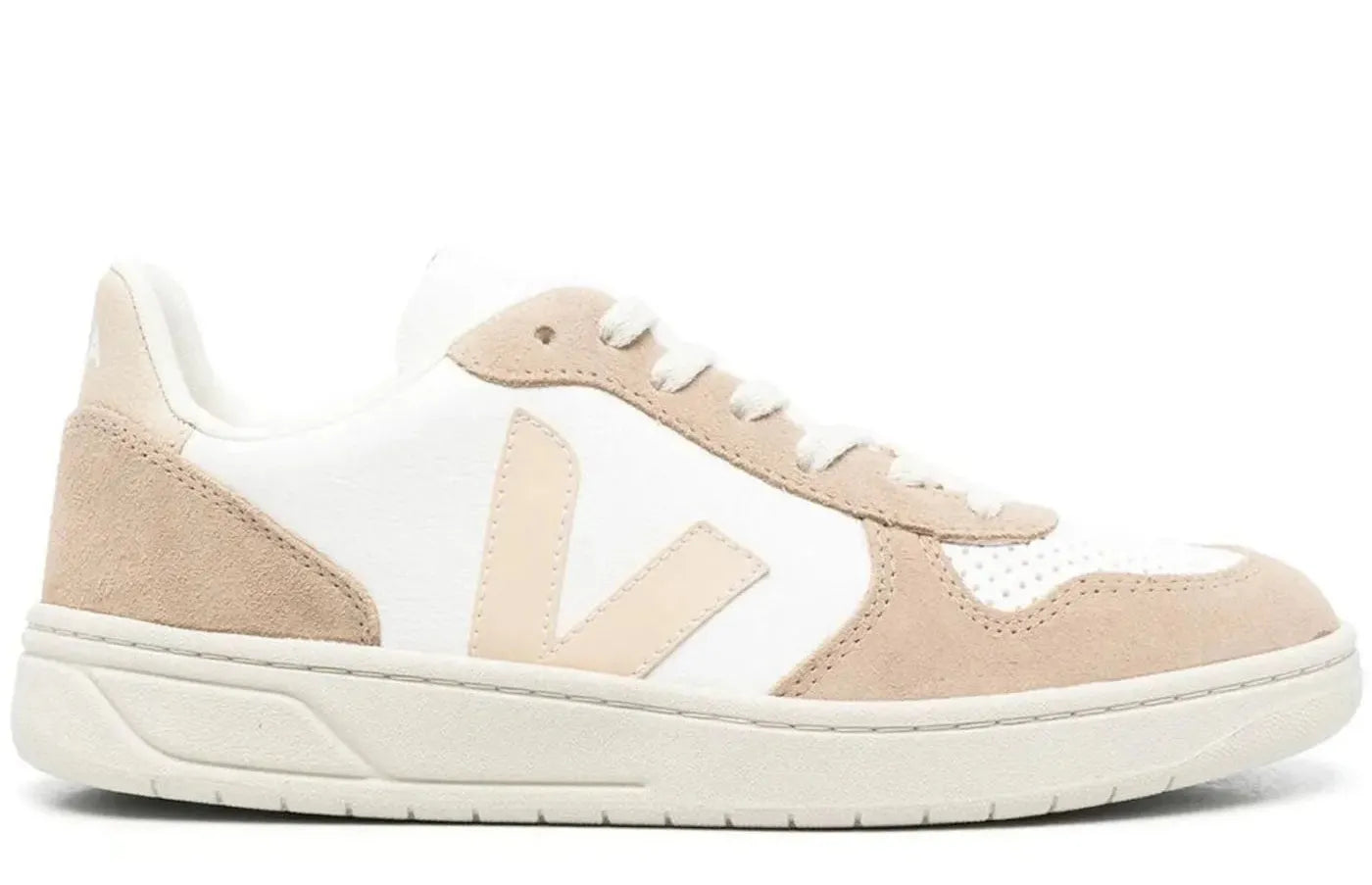 Veja V-10 features a stylish white sable sahara colorway that effortlessly combines fashion with function. With its ethically sourced chromefree leather, these sneakers have set a new benchmark in sustainable footwear.